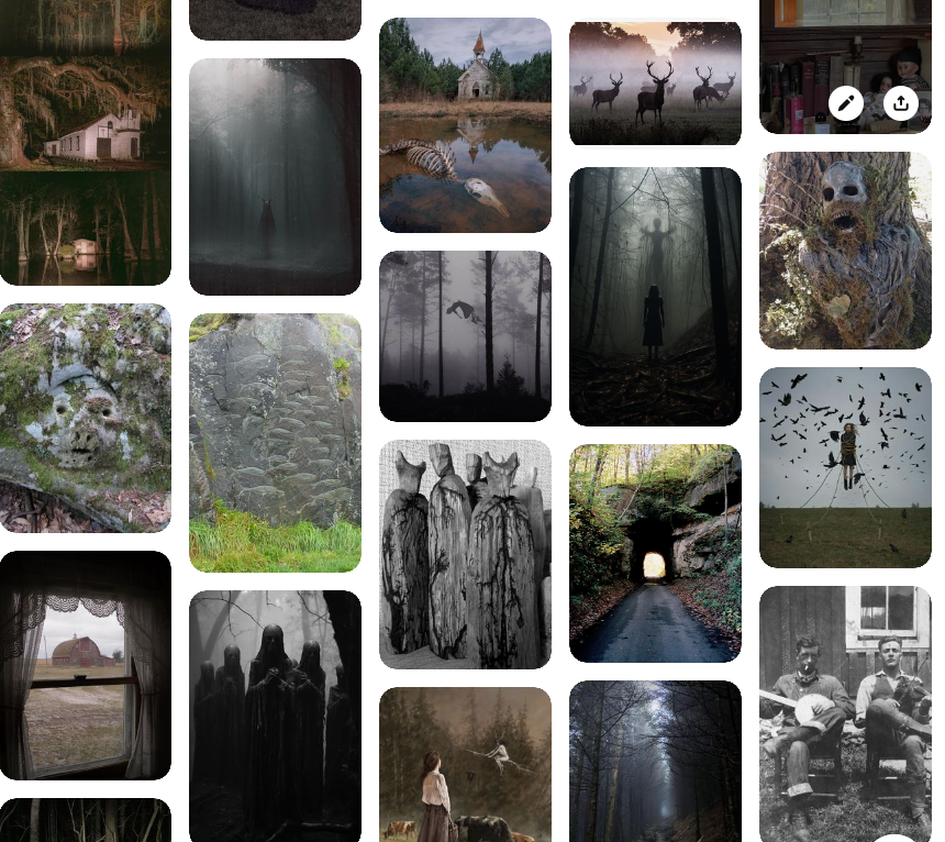 From there, I let those photos inspire and guide me. The churches reminded me of Ethel Cain, so I searched “Ethel Cain aesthetic.” and was met with religious horror, dolls and abandoned places. Following this pattern, I eventually curated about 25 photos to fully immerse myself into the world of The Twisted Ones. As you read, you can add or change photos on the board. Stones became a recurring detail in the story, so I looked for photos including rock formations and odd carvings. Deer and other wildlife found in the region were also talked about, so adding those was an easy jump.